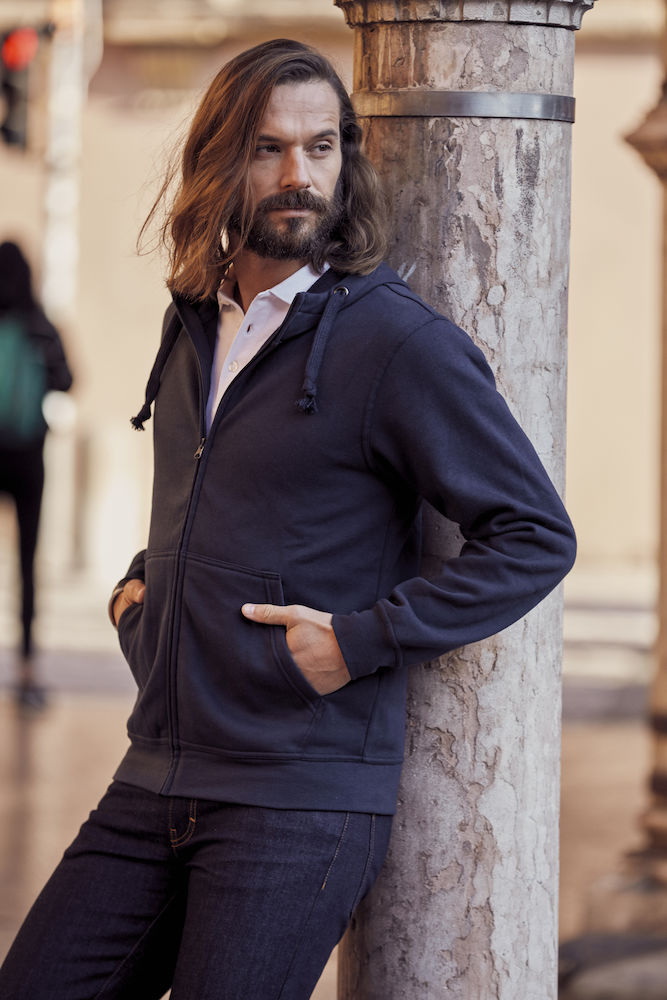 Felpa uomo cappuccio con cerniera divisibile, confortevole e pratica. Il tessuto polycotton garzato e le costine elasticizzate resistono nel tempo ai lavaggi intensivi. Design essenziale e fitting perfetto. Tasconi con elastico per telefono e asole per auricolari. Un capo moderno ed affidabile da indossare a scuola, al lavoro e nel tempo libero. Scegli il tuo colore preferito fra i 9 disponibili.