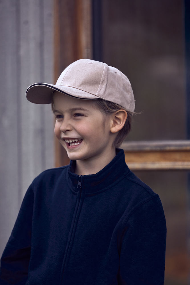Cappellino bambino in twill di cotone spazzolato. Tessuto morbido e molto consistente, facilmente lavabile. Struttura a sei pannelli con asoline di aerazione. Visiera precurvata in sandwich con profilino in contrasto. Chiusura posteriore con cinturino in tessuto regolabile e fibbia metallica.