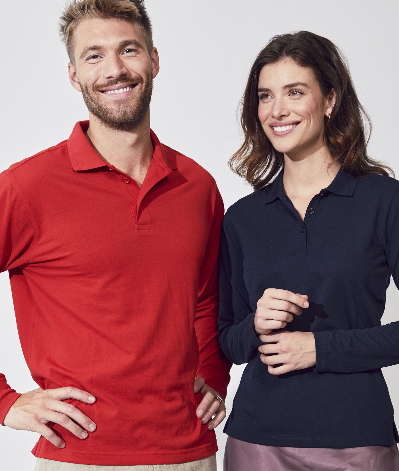 Polo donna polycotton manica lunga. Tre bottoni tono su tono. Nastrino parasudore. Bordo manica con costina nella versione uomo. Colletto con fregio. Spacchetti laterali. Vestibilità slim-fit.