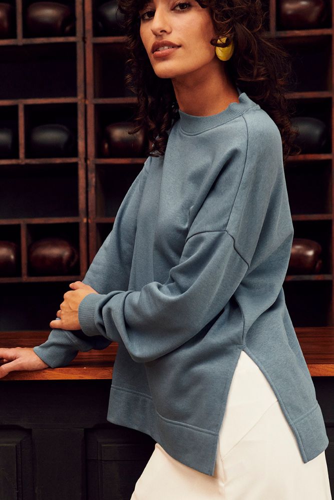 Felpa French Terry girocollo donna in cotone e poliestere riciclato. Tessuto morbido stabilizzato adatto ai lavaggi intensivi. Finissaggio antipilling. Costine 2/2 elasticizzate alte. Cuciture ribattute. Nastrino collo in twill in colore a contrasto. Etichetta facilmente removibile. Spalle scese. Spacchetti laterali.